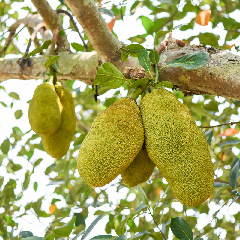 jackfruit, a tropical fruit believed to have originated in South India. This large, oblong to oval-shaped fruit is known for its unique appearance, with a green to yellow-green, spiky exterior. Jackfruit is typically available during the summer and fall months. The jackfruit boasts a fibrous, yellow flesh with a distinctive sweet and fruity flavor. Its taste is often described as a blend of banana, pineapple, and mango, with a hint of bubblegum or even a savory note when young. The aroma is equally captivating, a fragrant and alluring mix of sweet tropical fruit that will surely tantalize your senses.